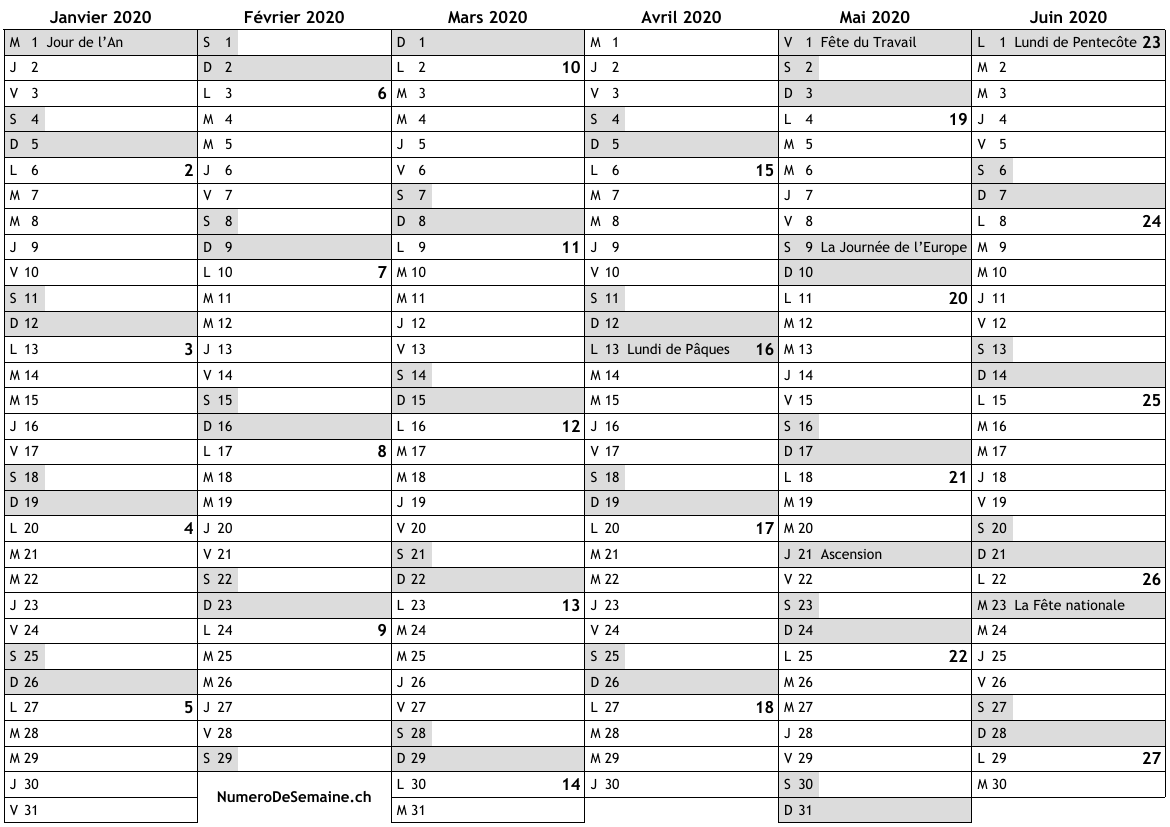 Calendrier 2020 avec jours fériés en Luxembourg et numéro des semaines … impression, gratuit