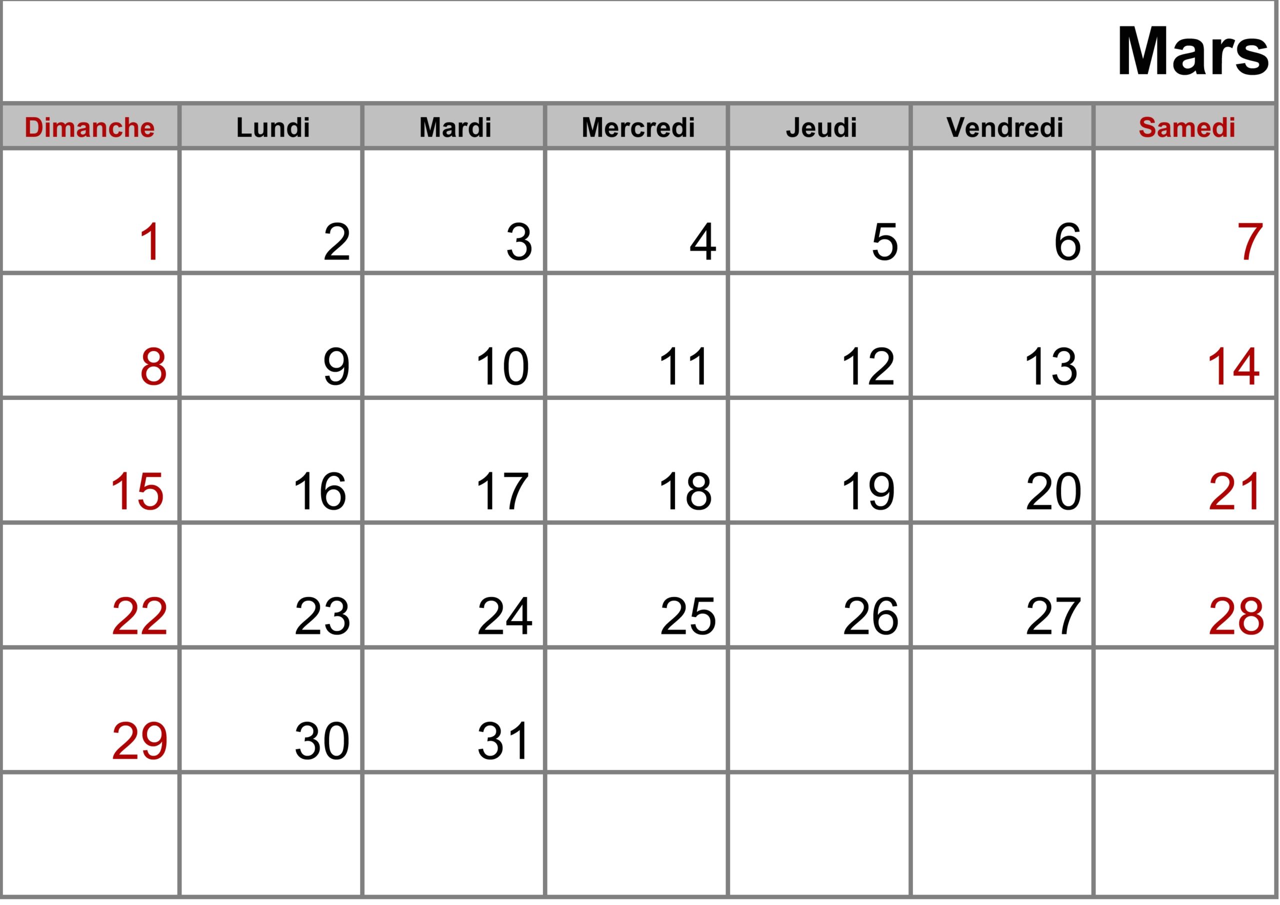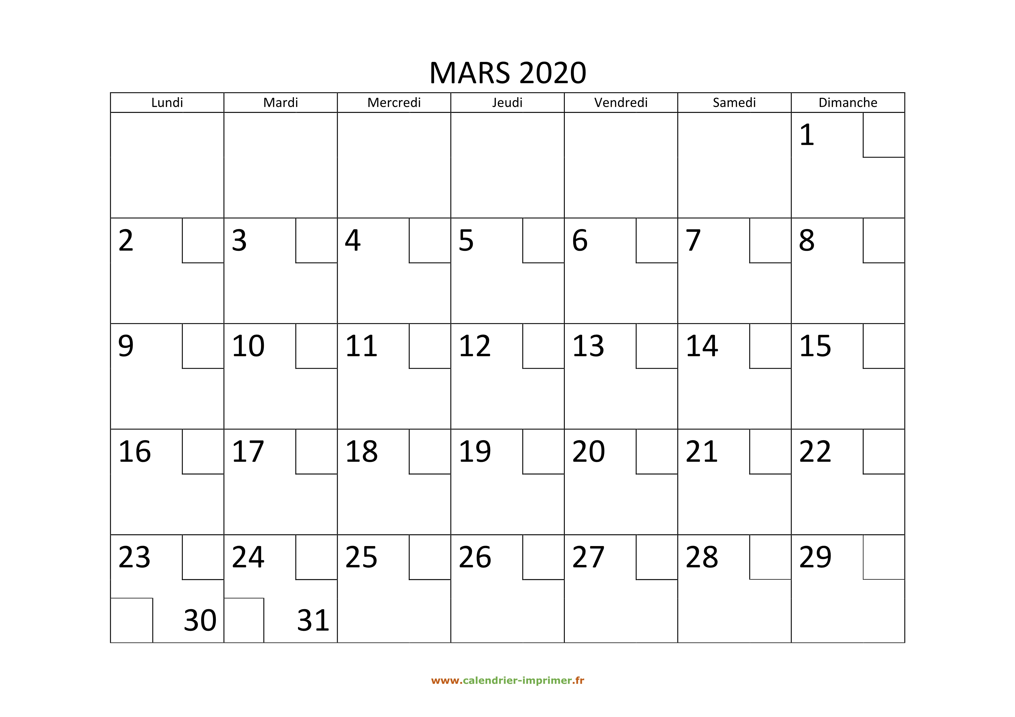 Calendrier mars 2020 à Imprimer gratuitement en PDF.