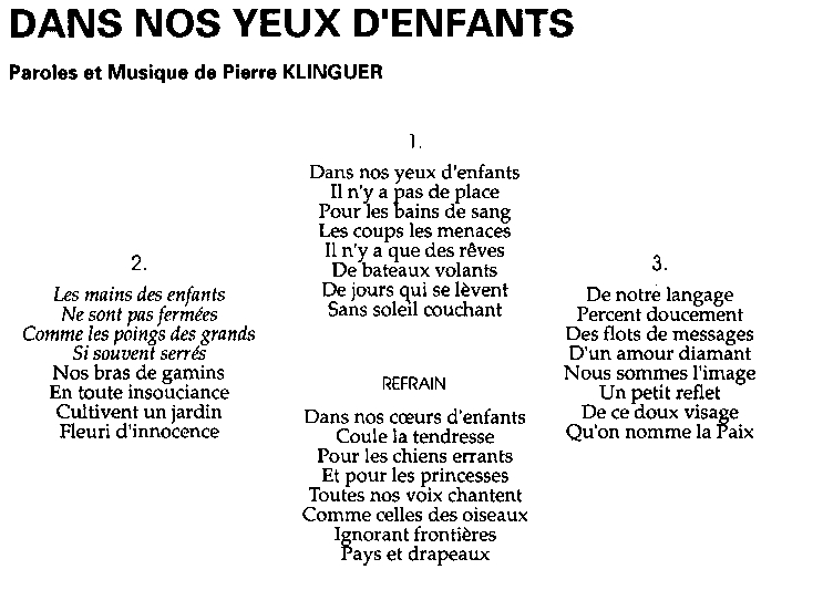 L'oiseau et l'enfant. Comme un enfant aux yeux de lumière Qui voit passer au loin les oiseaux Comme l'oiseau bleu survolant la terre Vois comme le monde… le monde est beau. Beau, le bateau dansant sur les vagues Ivre de vie, d'amour et de vent Belle, la chanson naissante des vagues Abandonnée au sable blanc. Blanc, l'innocent, le sang du poète Qui en chantant invente l'amour Pour que la.