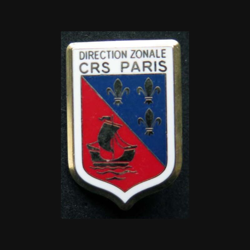De gueule, la nef de la ville de Paris (75) voguant sur des ondes, représente le rattachement de la 8 au premier groupement puis à la première Direction Zonale des C.R.S. C.R.S. 61 - Vélizy-Villacoublay (78) Écusson à listel blanc portant au cap l'inscription CRS 61.