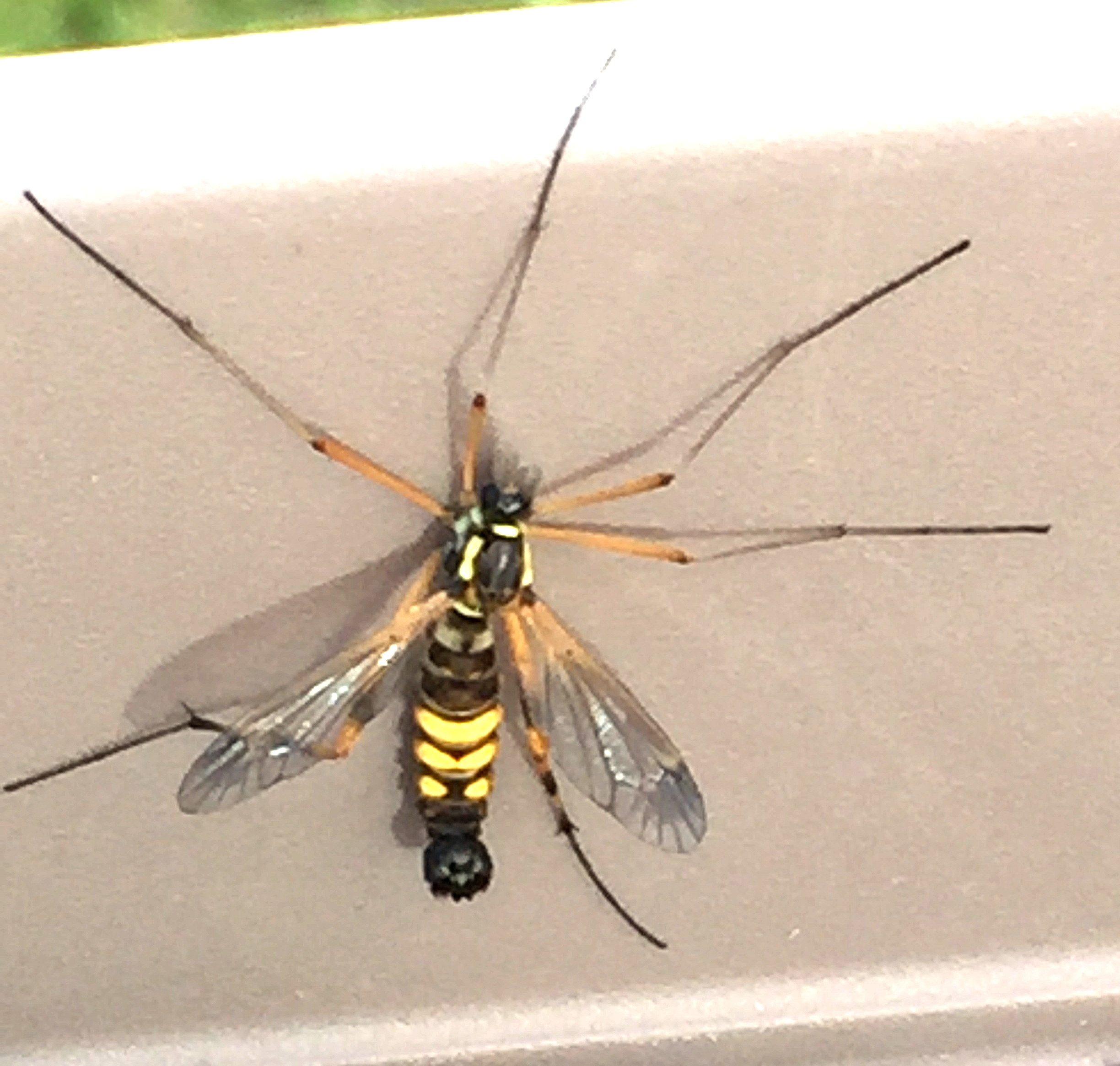 Gros insecte noir et jaune, abdomen recourbé vers le haut