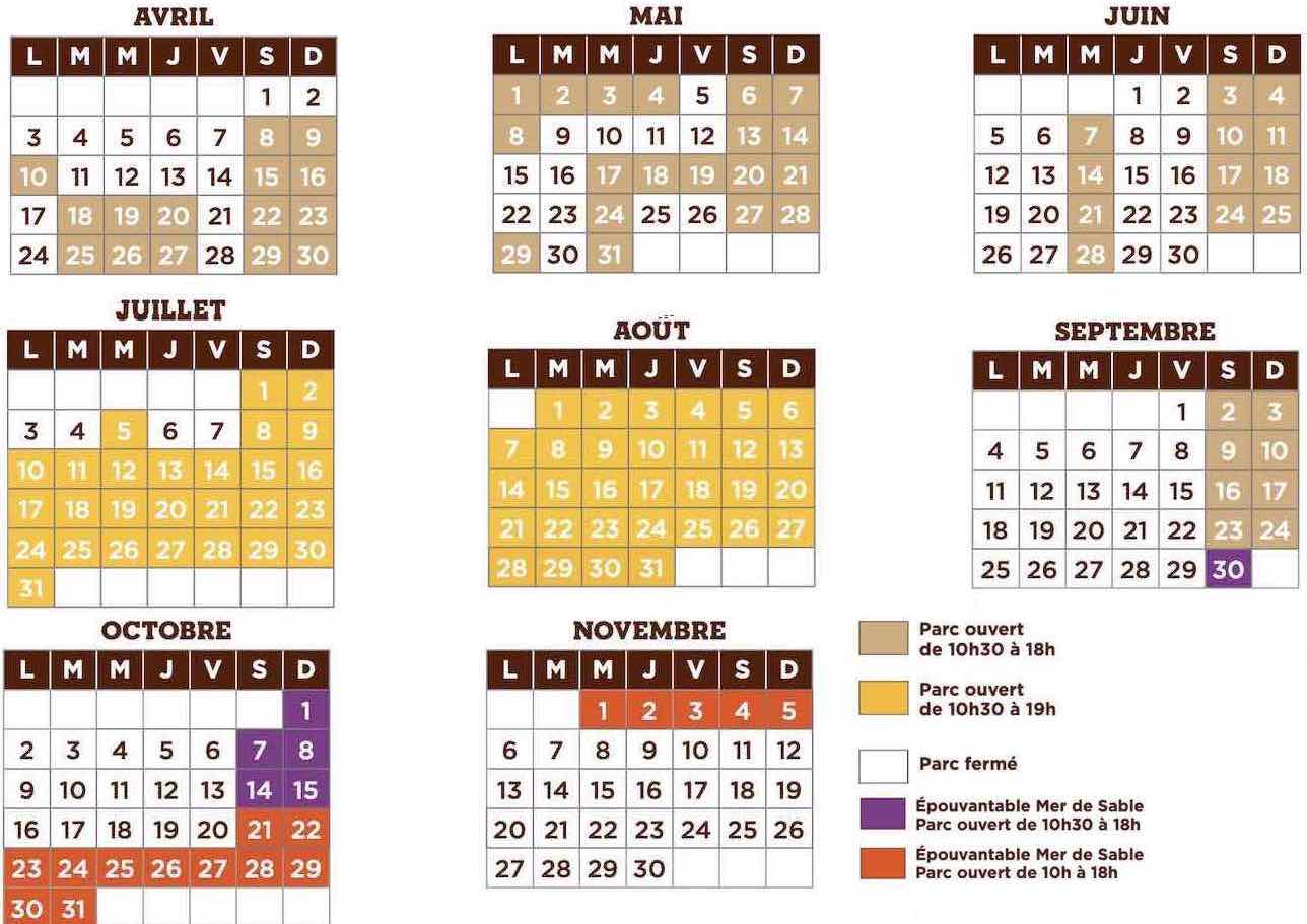- En octobre/novembre : début des festivités d'Halloween « Epouvantable Mer de Sable » le 5, parc ouvert chaque week-end puis sans interruption du 19 octobre au 3 novembre pour la Toussaint. Horaires Mer de Sable: le parc ouvre ses portes le matin à 10h ou 10h30 et ferme le soir à 17h, 18h ou 19h selon la période.