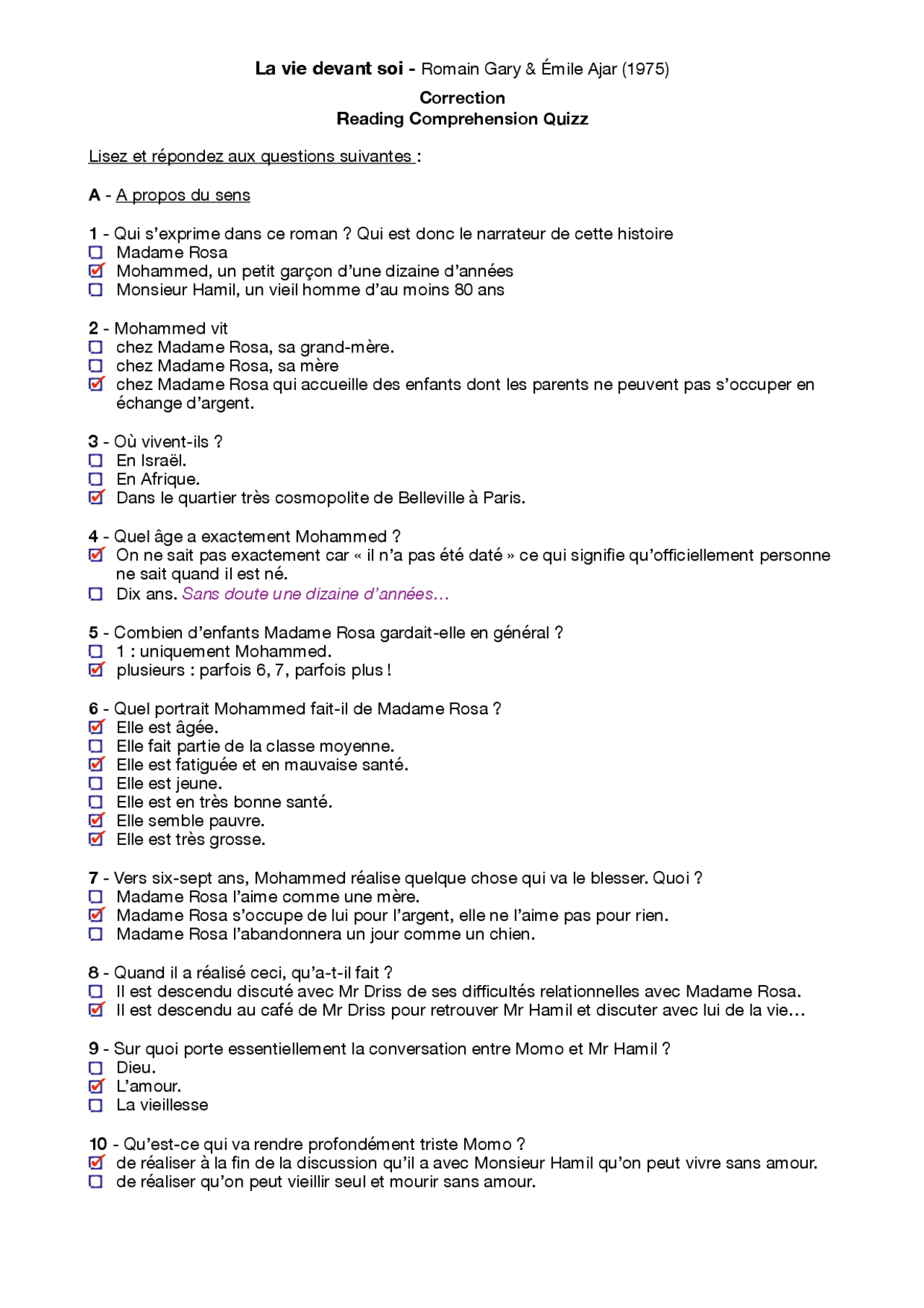 Gary, La vie devant soi Reading Comprehension Quizz Docsity