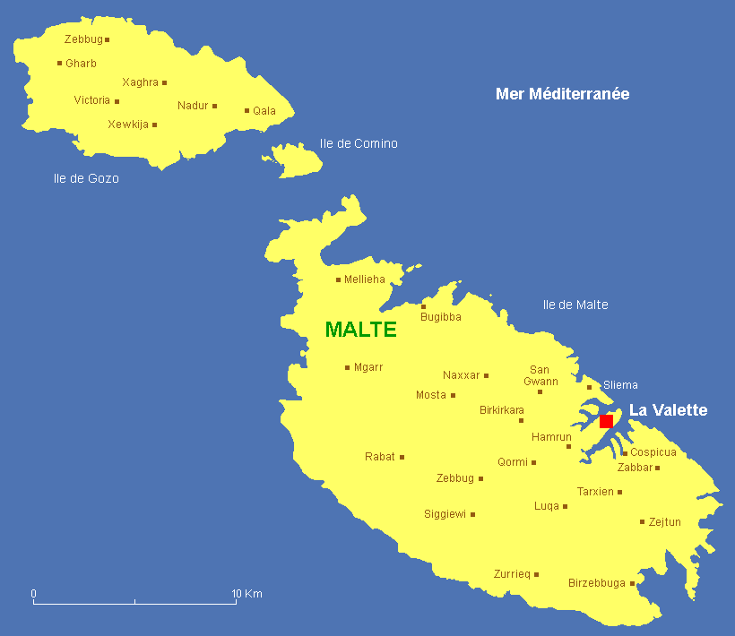 L'île de Malte est un État indépendant qui fait partie de l'union européenne. Il se trouve au milieu de la Méditerranée, un peu moins de 100 km au sud de la Sicile et à un peu plus de 200 km au nord de la Tunisie. Ce petit pays forme un archipel de plusieurs îles : l'île de Malte qui est la plus grande, l'île de Gozo, l'île.