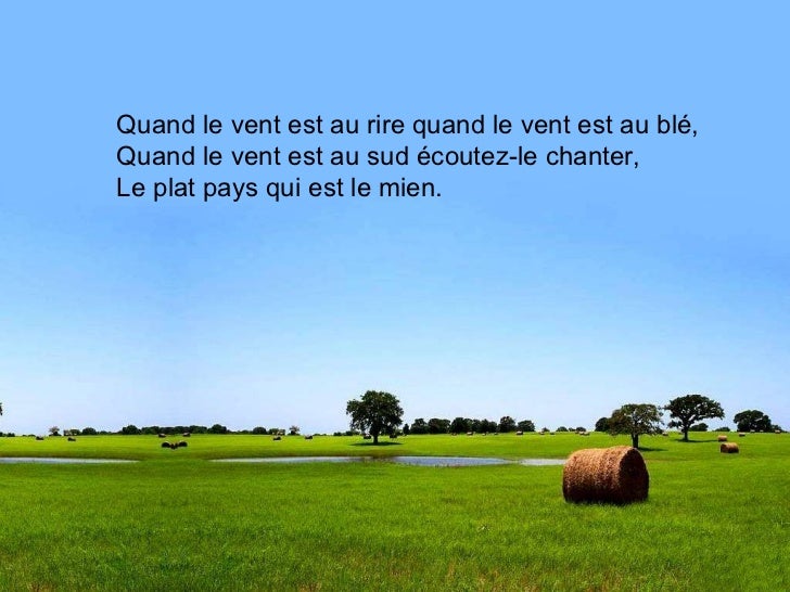 Le plat pays qui est le mien. verse. Avec un ciel si bas qu'un canal s'est perdu. Avec un ciel si bas qu'il fait l'humilité. Avec un ciel si gris qu'un canal s'est pendu. Avec un ciel si gris qu'il faut lui pardonner. Avec le vent du nord qui vient s'écarteler. Avec le vent du nord écoutez-le craquer.