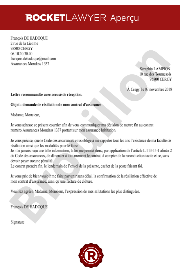 Dénonciation de reconduction tacite de votre contrat d'assurance