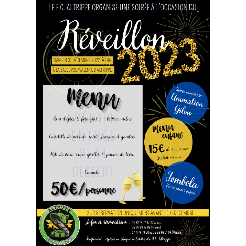 Soirée Nouvel An 2023 organisée à la salle des Fêtes par l'A.S. Téting/Pontpierre. Menu Réveillon : kir et assortiment de mignardises, buffet froid (foie gras, charcuterie et saumon fumé) et buffet chaud (rôti de veau et ses pommes grenailles), assortiment de mignardises sucrées, café et soupe à l'oignon.