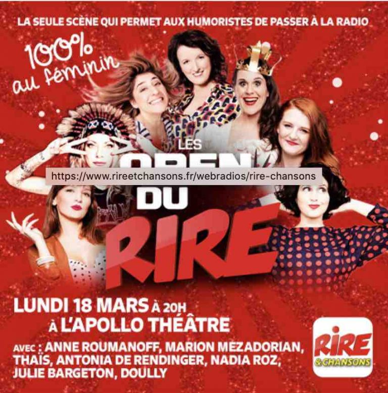 Les Open du Rire : une fois par mois, écoutez en live et en public , depuis l'Apollo Théâtre à Paris, les nouveaux talents du Rire sélectionnés par Rire et Chansons. Et c'est en live à la radio dès 20h