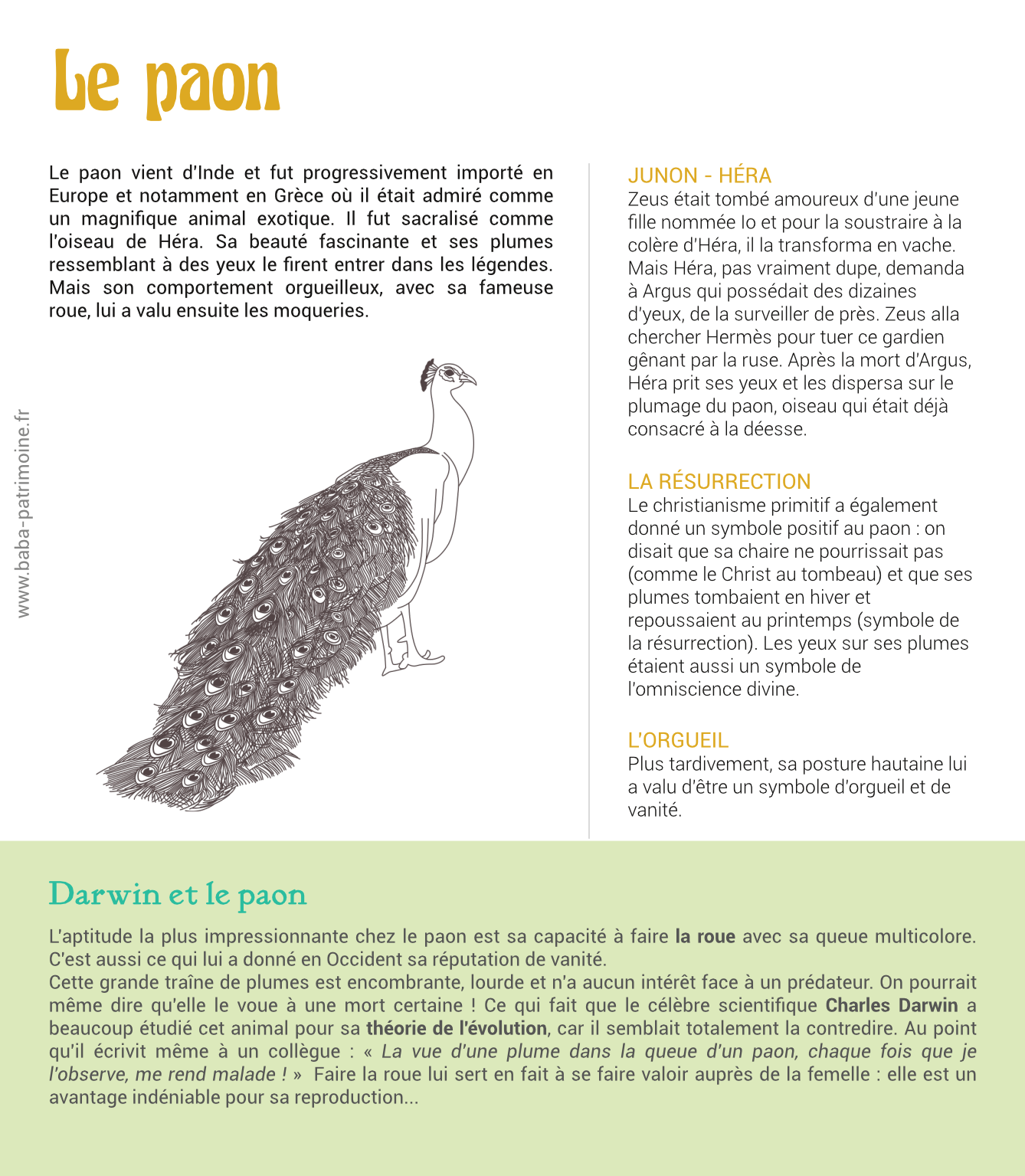 On évoque souvent le paon pour parler d'orgueil ou de vanité. Mais cette association n'existait pas dans l'esprit des premiers chrétiens qui y voyaient plutôt un symbole de la résurrection du Christ. Un symbole solaire. Dans le monde gréco-romain, le paon est un symbole solaire sans doute inspiré par le déploiement de sa queue en.